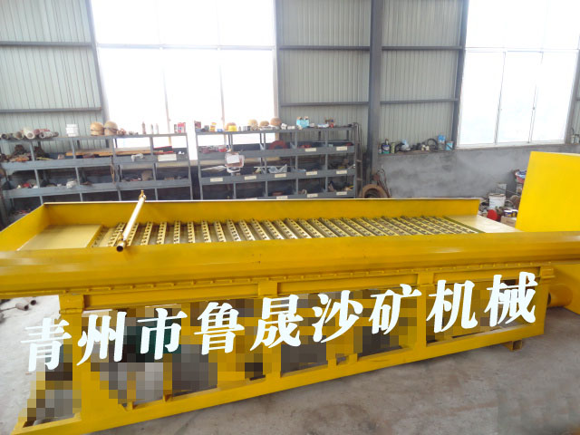 它的工作原理是上下鼓動,底部有硅膠板。硅膠板上部有隔水槽用于分流進(jìn)水和富集黃金。鼓動溜槽通過上下鼓動將輕重礦物分離,輕的沙子通過上下鼓動的水流帶走排出為尾礦,精礦比重高會留在被隔水槽留住,留在隔水槽的底部。這種溜槽因?yàn)榘l(fā)明的時間早,知道此設(shè)備的人多,所以用的比較多。但是這個設(shè)備的弊端也非常的明顯,因?yàn)樗荒芑厥沾箢w粒的黃金,細(xì)顆粒的毛細(xì)金、片金、微粒金都會隨水跑掉的。